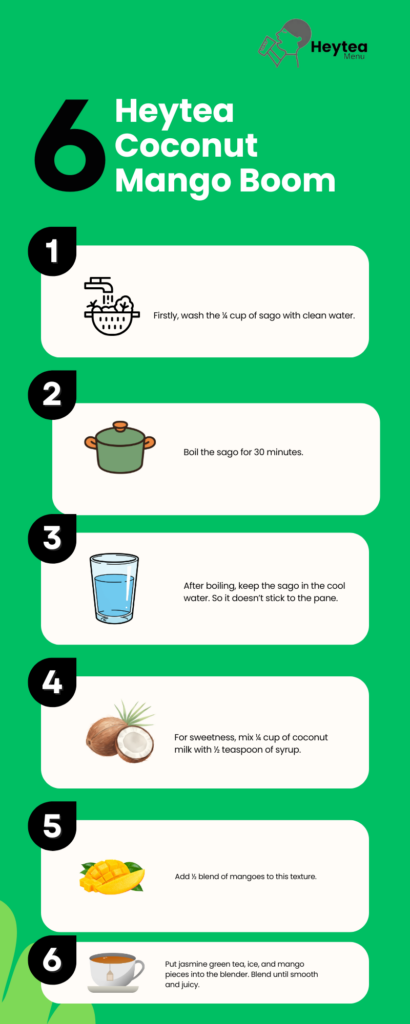 It is crafted with fresh mangoes, creamy coconut milk, and added to a cooked 30-minute daily sago with coconut jelly. If you want to make it at home, check out the HeyTea coconut mango boom recipe listed below: